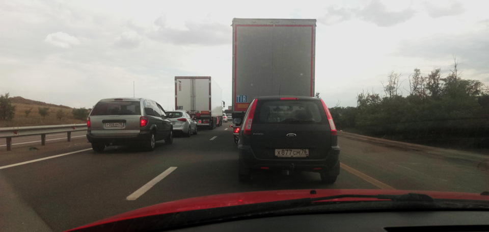Поток машин просто огромный, двух полос в одну сторону явно не хватает. Правая полоса полностью занята фурами, и едет со средней скоростью 80-100км/ч. Левая едет лишь немного быстрее — около 110-120км/ч. Передвигаться быстрее нереально, сильная толкучка машин в левой полосе.