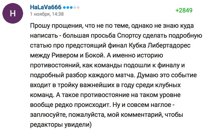 Когда «Бока» и «Ривер» только вышли в финал, многие пользователи просили нас написать анонсирующий текст. Комментарий на эту тему под новостью о Леониде Федуне собрал почти 3000 плюсов.