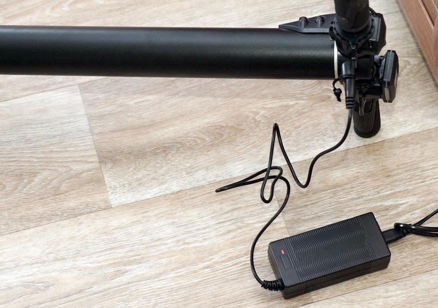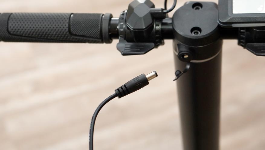 Заряжается самокат через разъем DC-джеком. Коннектор стандартный, а вот напряжение зарядки не самое распространенное: 29.4 В. На корпусе разъема присутствует защитная резиновая крышка.