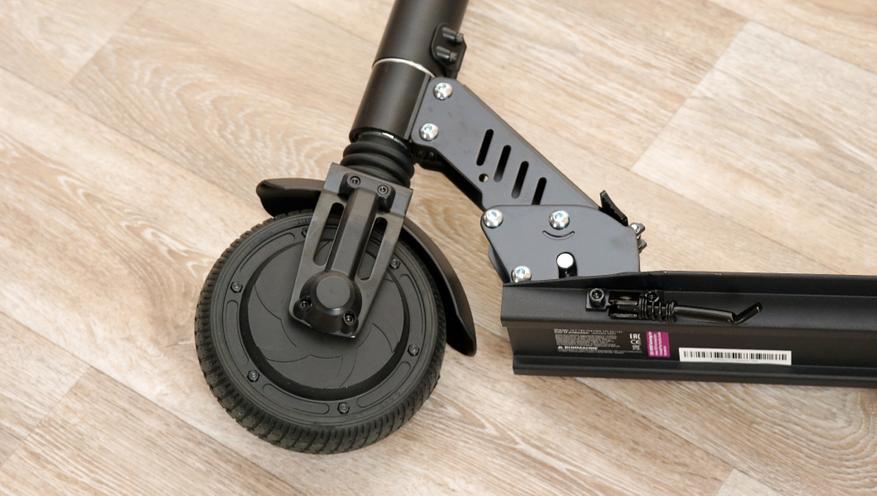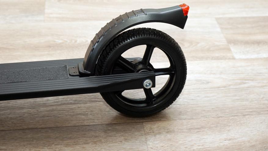 Самокат оборудован двумя 8,5-дюймовыми колесами с надувными шинами. На заднем колесе расположен дисковый тормоз.