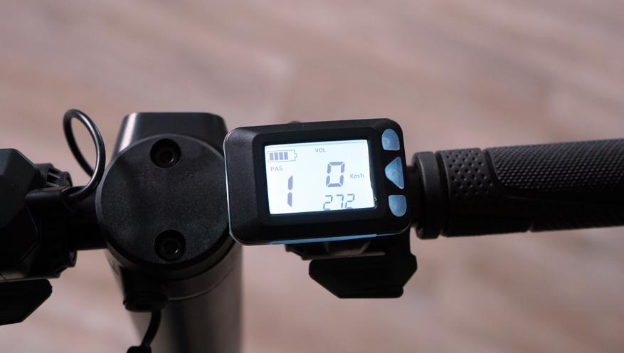Справа на руле есть бортовой компьютер с тремя кнопками. Информацию на нём отчётливо видно как под прямыми лучами солнца, так и ночью — благодаря подсветке. Длительное удержание центральной клавиши включает и выключает питание. Короткие клики меняют отображаемые данные на дисплее: общий пробег, километраж текущей поездки, её время, напряжение АКБ. Постоянно же высвечиваются на экране скорость, режим езды и заряд батареи. Под компьютером расположилась гашетка газа с очень длинным ходом. Если нажать её до упора, то до рычага тормоза становится трудно дотянуться. Благо, производитель расположил тормоза иначе, чем в большинстве велосипедов, так под правой рукой находится передний тормоз, под левой — задний (основной).