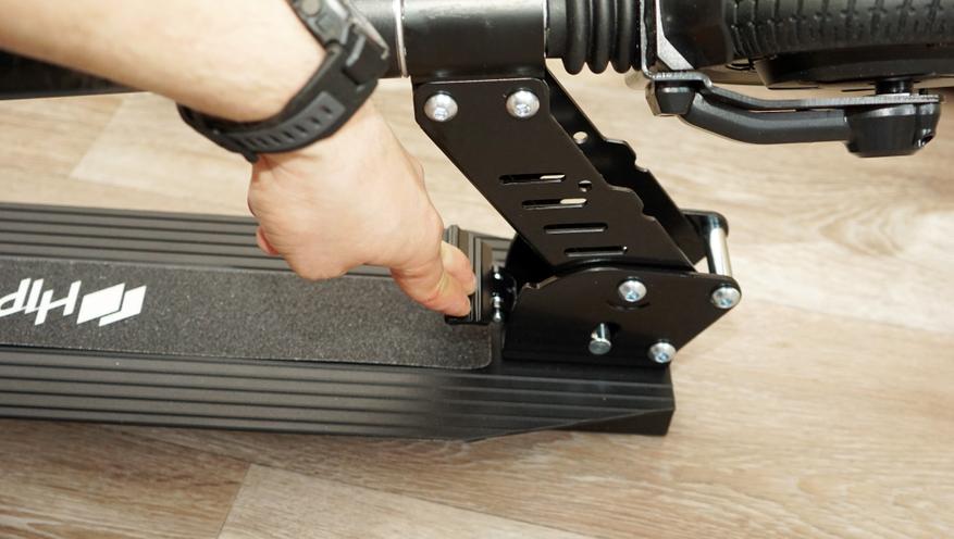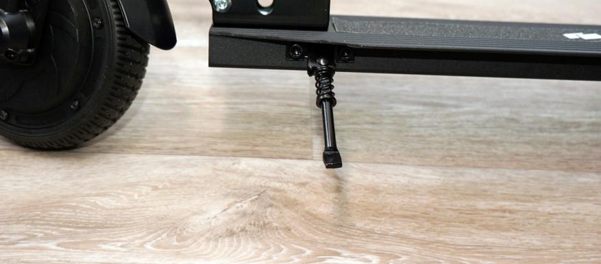 Как и в других моделях, в самокате Hiper Stark DX650 предусмотрена подножка-подставка для удержания в вертикальном положении в тот момент, когда вы не пользуетесь им. Расположена эта подножка на левой стороне деки, ближе к переднему колесу и имеет пружинный фиксатор.