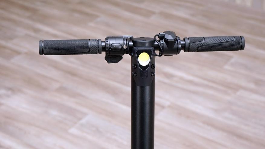 Руль простой Т-образный, с двумя прорезиненными ручками. Размещение электроники в стойке смещает центр тяжести самоката вверх, но делает его использование более удобным. Стойка руля гладкая, при желании можно установить дополнительную «детскую» ручку.