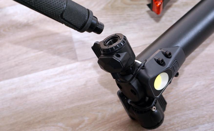 На передней части руля расположена достаточно крупная фара (фонарь) для освещения при передвижении в темное время суток. Установленные по боковым сторонам руля электронный тормоз и дисплей имеют возможность регулировки положения. Ключ (Г-образный шестигранник) имеется в комплекте. Вместе выхода кабелей из корпуса устройств присутствует силиконовый уплотнитель для защиты от влаги/грязи/пыли.
