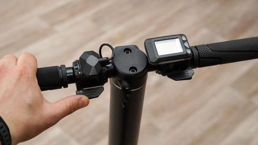 Экран контроллера включается долгим нажатием на среднюю кнопку (Mode). После включения доступна информация об уровне заряда, пробеге и т.п. Для передвижения предлагается выбрать один из трех скоростных режимов (1-2-3). Режимы отличаются уровнем потребления (экономичностью), максимальной скоростью и динамикой разгона. Под экраном расположена гашетка электронного газа, которая и приводит самокат в движение.