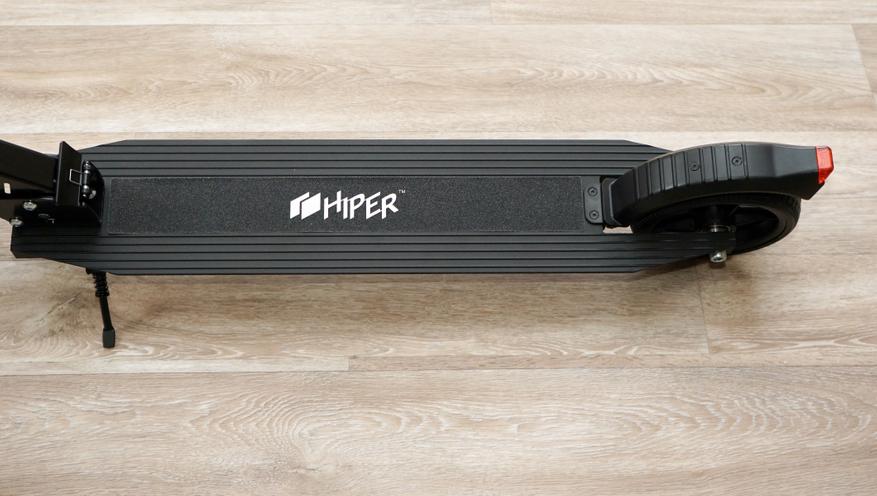 Дека имеет продольное рифление, а также специальное покрытие для увеличения сцепления. Подобное решение положительно сказывается на устойчивости, сводя на нет скольжение подошвы обуви по деке. На стойке руля, а также на деке нанесена надпись с логотипом «Hiper».