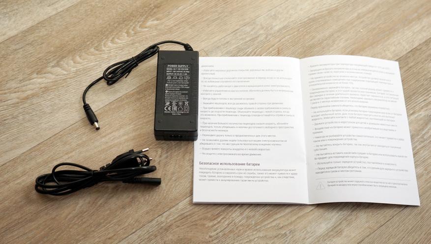 Зарядное устройство HLT-180-2941000 предназначено для литиевых батарей типа 7S. Ток зарядки небольшой (1А). Напряжение на выходе около 29 В. Имеется индикатор работы/завершения зарядки. Руководство пользователя на русском языке, достаточно подробное. Приведены основные моменты по использованию самоката, зарядке, по работе с контроллером, а также объяснение типовых неисправностей.