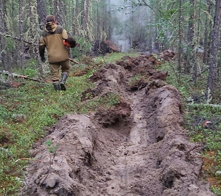 Тракторист едет впереди по старой колее, сворачивая, чтобы захватить те места, где пожар успел прорваться за распаханную полосу. Сразу за ним идут добровольцы с лопатами и водой, срубают обгоревшие деревья, которые могут упасть. Затем спасатели полностью расчищают колею. По пути слышен треск деревьев, впереди виднеется небольшое пламя у корней. Рядом с такими очагами становится жарко, дышать сложнее. Кое-где землю покрывают уцелевшие кусты голубики. Комаров нет.