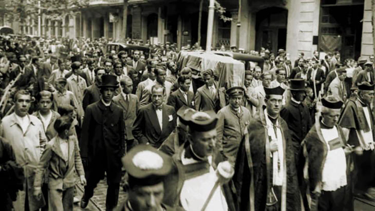 Первая золотая эра сменилась тяжелейшим временем в истории «Барселоны». В 1930-м стало известно о самоубийстве Жоана Гампера. После отстранения здоровье основателя «Барселоны» ухудшилось, он находился в затяжной депрессии, а биржевой крах 1929 года обнулил сбережения Гампера. На фото его похороны.