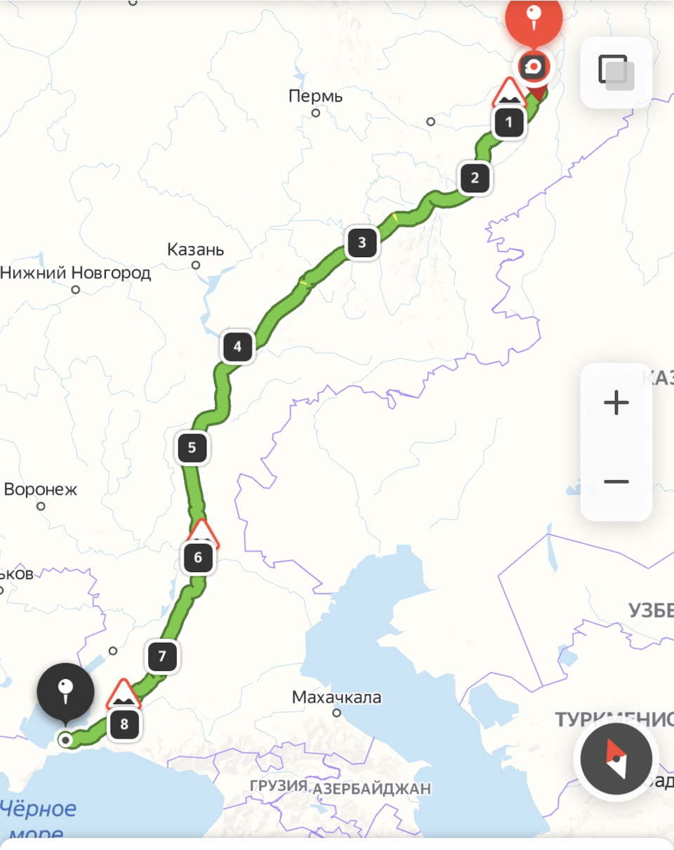 Наш маршрут: Тюмень — Екатеринбург — Сим — Уфа — Самара — Тольятти — Жигулевск — Сызрань — Саратов — Волгоград — Сальск — Тихорецк — Усть-Лабинск — Белореченск — Апшеронск — Туапсе — Сочи — Адлер.