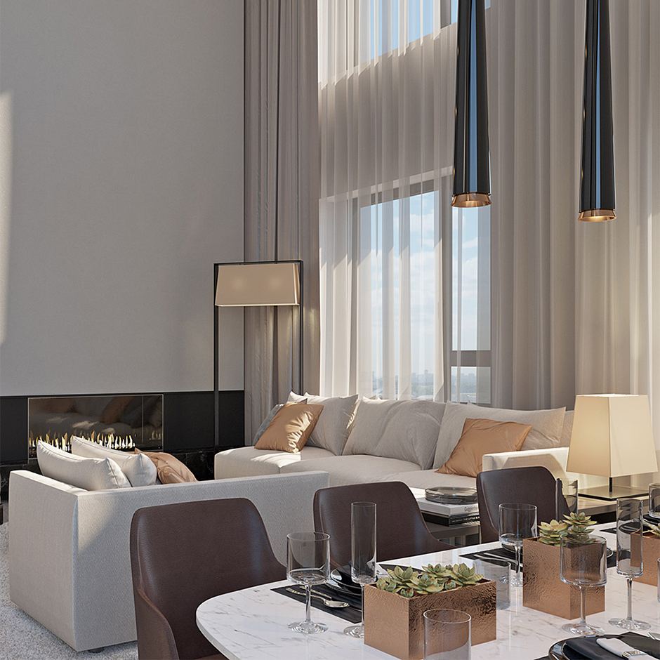 Необычные планировки. Пентхаусы с террасами и летними кухнями на крыше, двухуровневые квартиры с панорамным остеклением, которое визуально расширяет пространство комнат, а также квартиры с отдельным входом и палисадником.