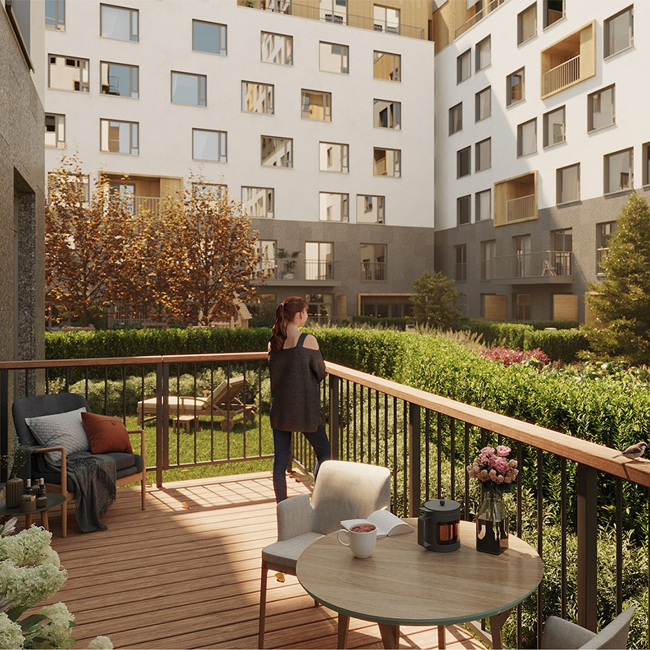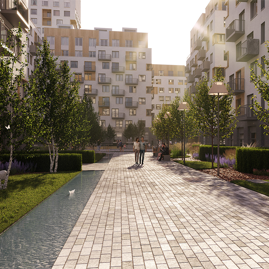 Площадь с фонтанами во дворе. Вокруг квартала организован парк, а во дворе одного из домов спроектирована площадь с фонтанами. В теплое время года здесь особенно приятно проводить вечера с друзьями или семьей, ужиная на открытой веранде в одном из кафе.