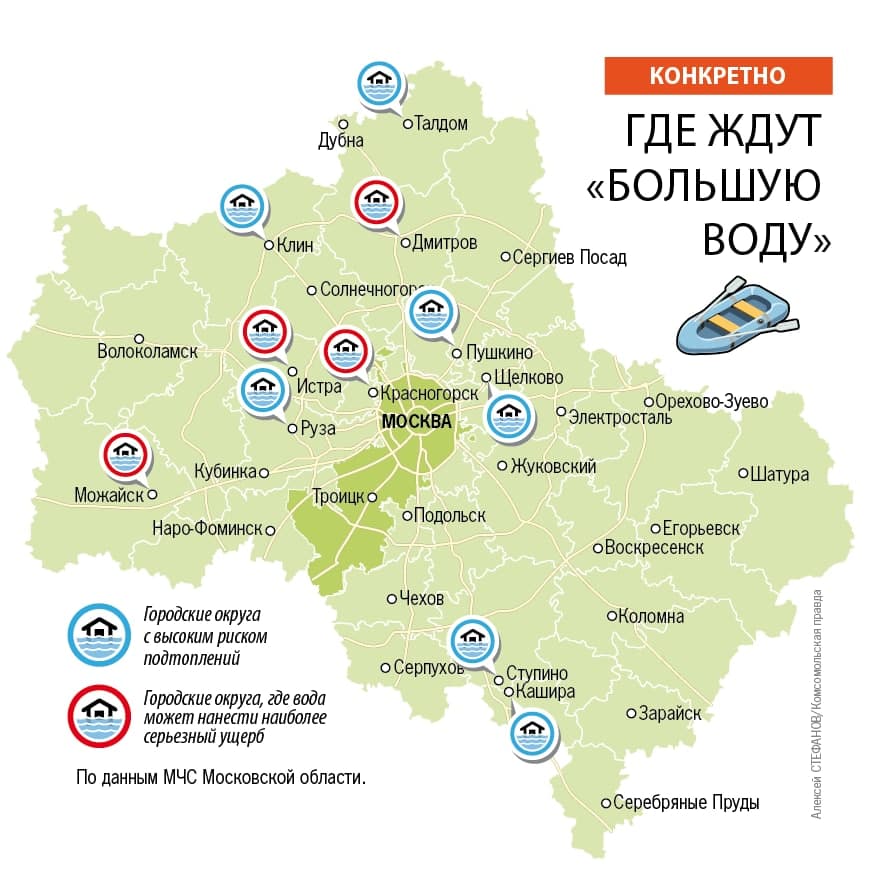 По оценкам специалистов, в зону подтопления могут попасть 158 населенных пунктов и около 70 СНТ (садовые некоммерческие товарищества), расположенных на территории 30 городских округов Подмосковья.