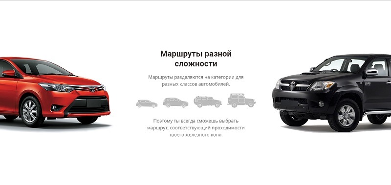 Все маршруты разделены по уровню подготовки автомобиля – от маленьких пузотерок до злых подготовленных монстров. Поэтому Вы можете выбрать маршрут, соответствующий Вашему железному коню, Вашим амбициям и интересам.