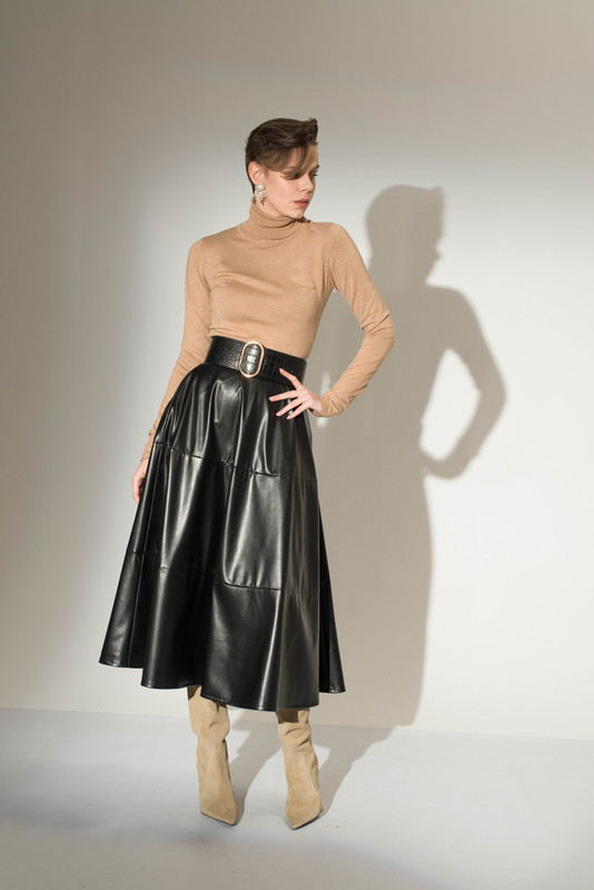 Мне нравится силуэт юбки, но я бы комбинировала ее не с гольфом, как на фото, а с чем-то более объемным: какие-нибудь модные сейчас рукава-фонарики, летящая блузка.