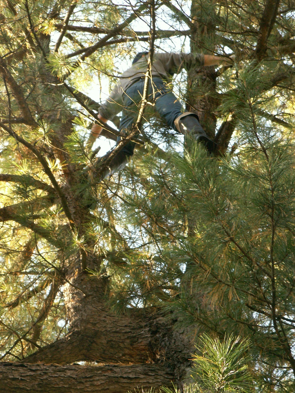 Пошли дальше. Нашли еще более-менее подходящего хвойного красавца, теперь уж настала моя очередь. Перчатки сразу пришлось выбросить, голая рука куда крепче впивается в сук. Адреналин начал зашкаливать уже на середине. Одежда мешала, кеды чуть скользили, но я решил не сдаваться. Был некоторый испуг, силы, конечно, таяли, кое-какие участочки тела схватывались судорогой, но зато по мере взбирания открывались и захватывающие красоты.