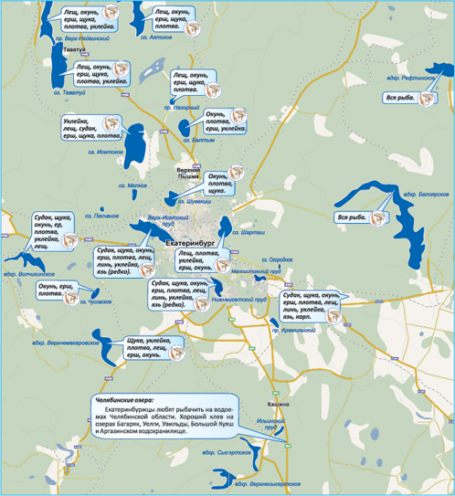 Екатеринбуржцы любят рыбачить на водоемах Челябинской области. Хороший клев на озерах Багаряк, Уелги, Увильды, Большой Куяш и Аргазинском водохранилище.