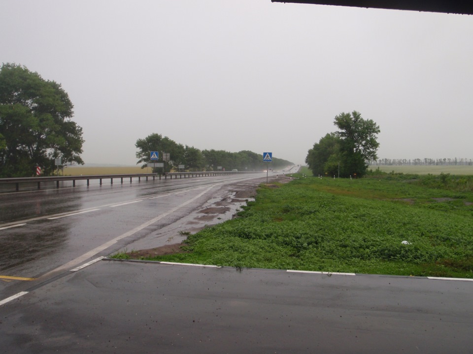 Пережидать было бессмысленно, поэтому заезжаем в ближайшую остановку, выливаем воду из обуви, наряжаемся в дождевики и плывем в сторону Ростова. Дождевики мы взяли не очень удачные, от дождя они почти не защищали. Зато защищали от встречного ветра. А это оказалось очень важно.