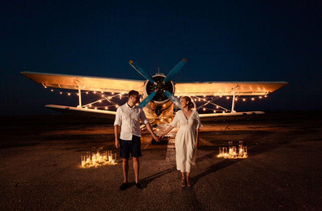Планируя свадебную церемонию или свадебный ужин, пары часто отказываются от милых сердцу идей по причине того, что площадка не вмещает запланированного количества людей или воплощение мечты невозможно при большом скоплении народа. Для троих или четверых человек (молодожёны + фотограф и видеограф) преград практически не существует. Вы можете хоть опуститься на дно водоёма с аквалангами, хоть взлететь над городом на вертолёте, хоть умчать в поля на велосипеде-тандеме. Палатка в лесу, пикник на крыше жилого дома, путешествие по городу или области на самом крошечном автомобиле – все эти опции доступны для вас двоих. Сужая границы, вы расширяете их!