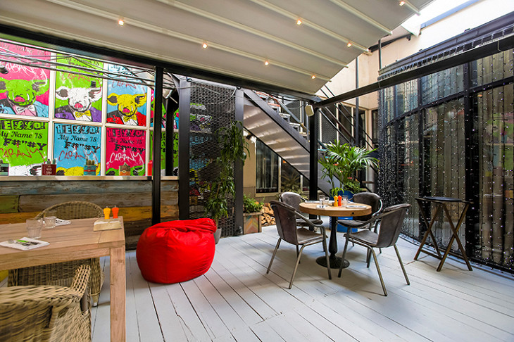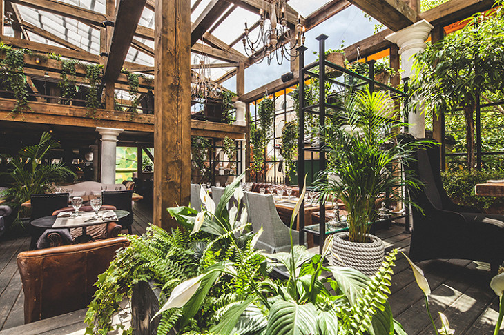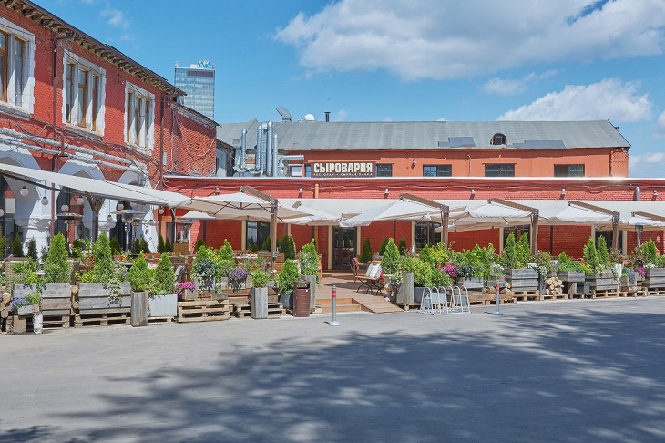 Украшенная цветами веранда у входа в ресторан спрятана во дворе между красно-кирпичных фабричных строений «Красного Октября». На плетеных креслах тут одновременно уместятся 100 человек. На веранде работает свой оборудованный бар, а к футбольному нашествию на ней установят несколько экранов.