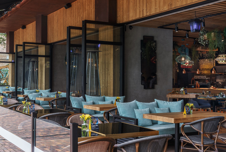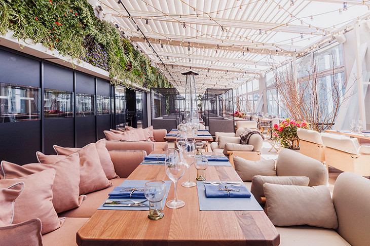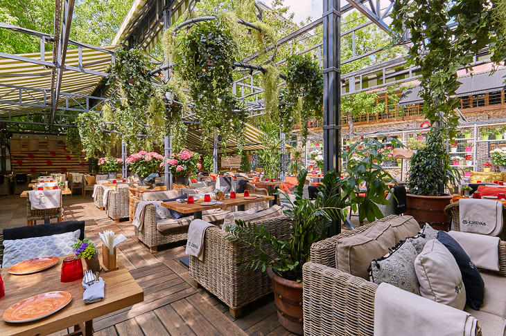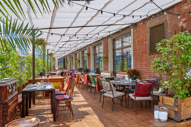 Совместный проект Аркадия Новикова и Уилльяма Ламберти находится на территории Бадаевского завода. Недавно открывшуюся веранду украсили под стать марокканскому стилю заведения: разложили яркие подушки с восточными узорами, цветные пледы и озеленили территорию цветами. На веранде работает то же меню, что и внутри ресторана, а это большой выбор мезе, пять видов хумуса, блюда из тажина, восточные супы, пахлава с пломбиром и малаби с сиропом из роз на сладкое. В начале июня на летней территории установят экраны и во время футбольного чемпионата обещают вести трансляции.