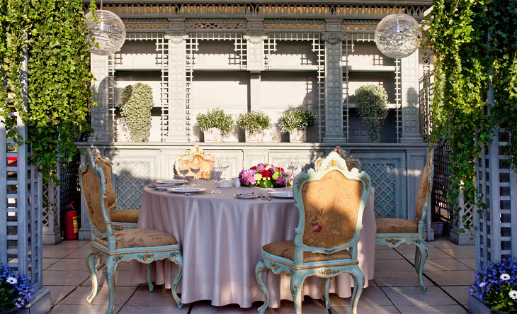 В «Турандот» для просмотра футбола подготовили два экрана на живописной летней веранде. Веранда правда роскошная — с нее виден Тверской бульвар, а шума машин не слышно. Внешне терраса напоминает трельяжный сад XIX века, где раньше устраивались балы, на ней даже есть фонтан. В зоне под названием «Флорентийский дворик» организуют тематическую фотозону: здесь появится газон и футбольные ворота.