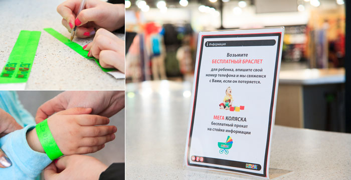 Еще один продуманный момент во имя безопасности ребенка – браслет «Не потеряйся!» Здесь же, на стойке информации, берем яркий браслетик, вписываем имя старшего ребенка и мамин телефон, закрепляем на ручке. Теперь, если молодой человек увлечется исследованием пространства и отстанет от обоза, сотрудники «Меги» или добрые люди помогут ему найтись.