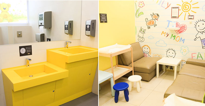 Здесь старший ребенок может сделать свои дела, пользуясь сантехникой по росту, а малышу можно сменить подгузник и хотя бы несколько минут отдохнуть от шума.
