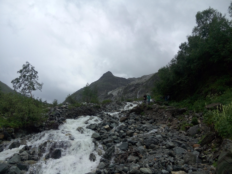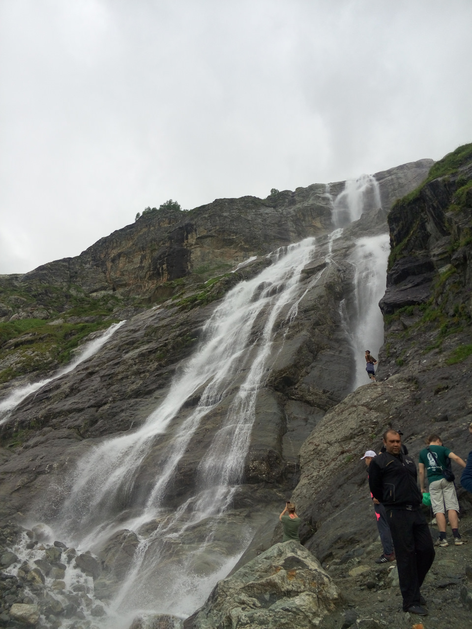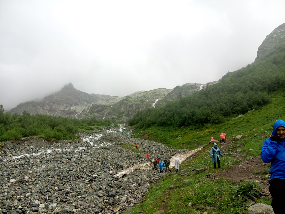 Уже почти пришли. Пока дождя нет у водопадов крутится куча народа, снижу поднимается еще больше. УАЗики постоянно подвозят-отвозят свежие партии людей в шлепках, которые уверенно шлепают по камням вверх. :)