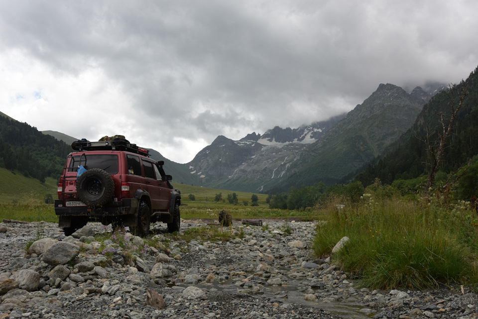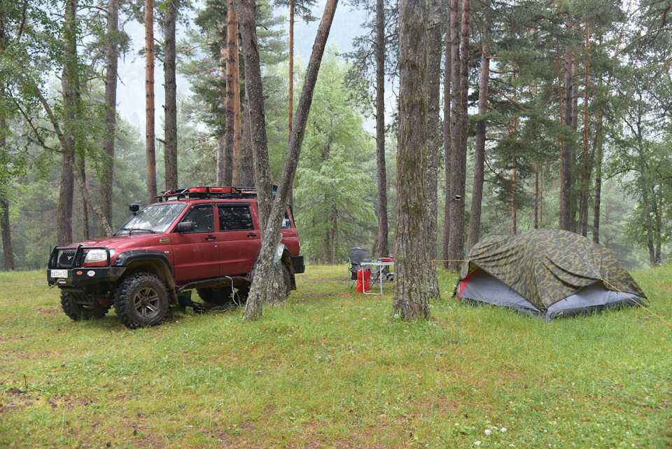 До этого я конечно успел накататься на авто по очень плохой дороге в от поляны Таулу вверх по Софие. Походить помедитировать перед дорогой проходящей по руслу реки с довольно высокой водой и не слишком простым въездом-выездом из нее для моего скромного микробуса. Сходить под дождем на разведку, найти местечко для палаток, пообедать и завалиться спать под барабанящий дождь.