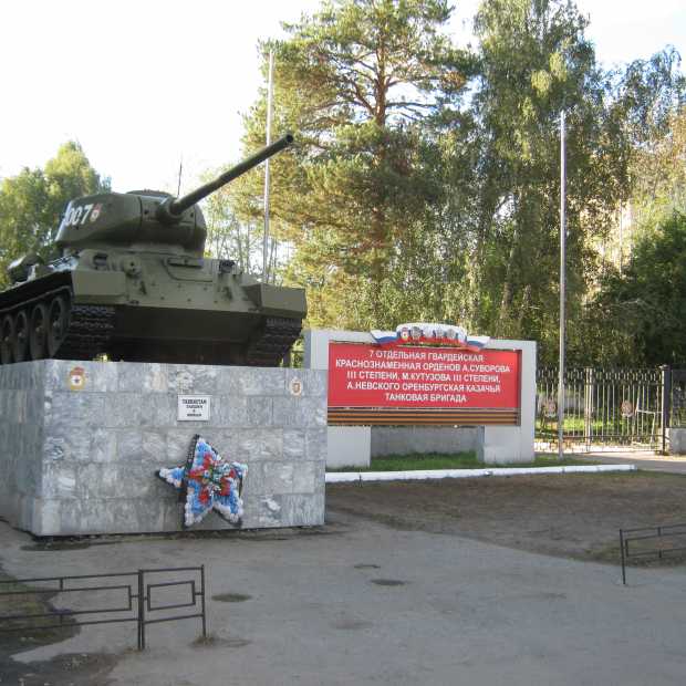 Танк Т-34 установлен возле КПП в военный городок 7-й отдельной гвардейской танковой Краснознаменной орденов Суворова, Кутузова и Александра Невского Оренбургской казачьей бригаде. В годы Великой Отечественной войны в Чебаркуле формировались военные соединения для отправки на фронт. Информация