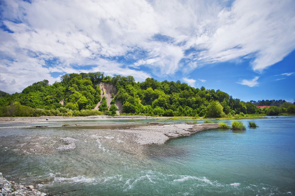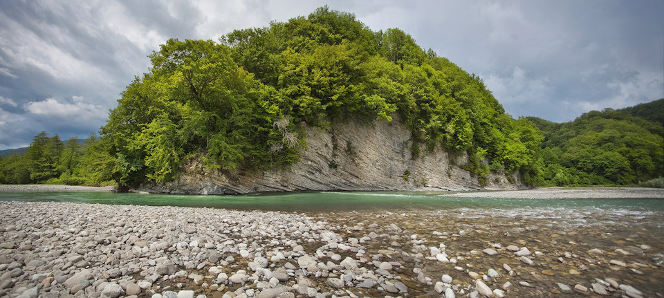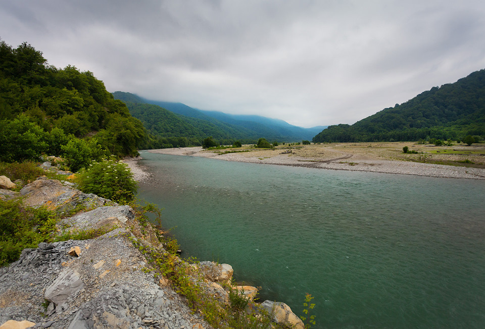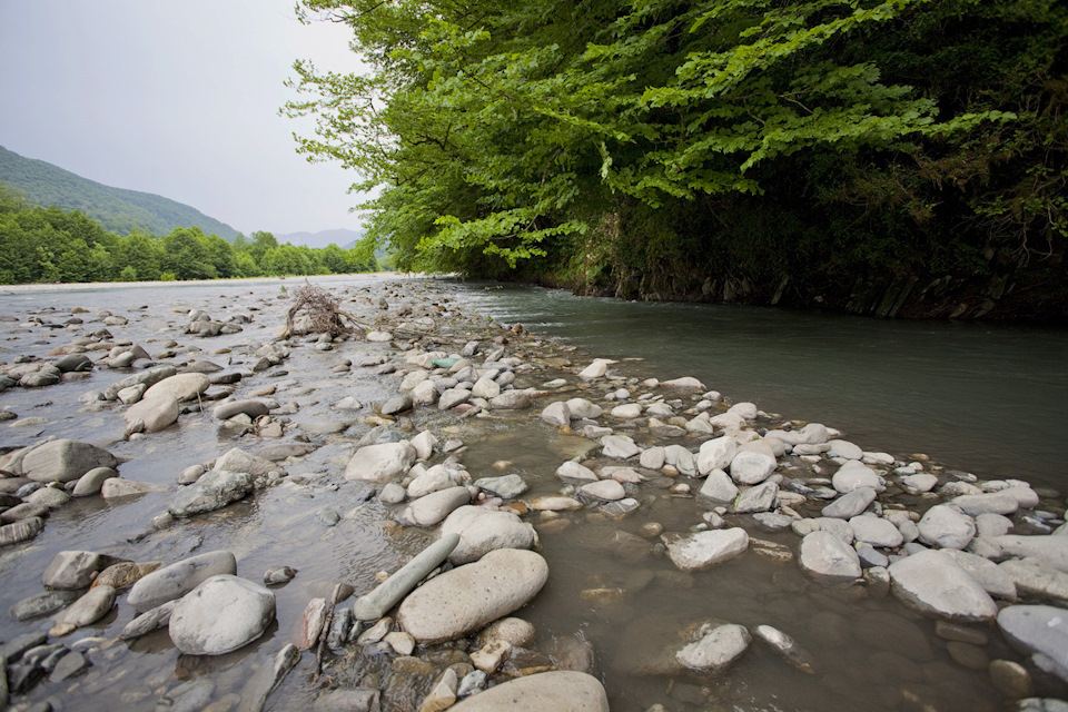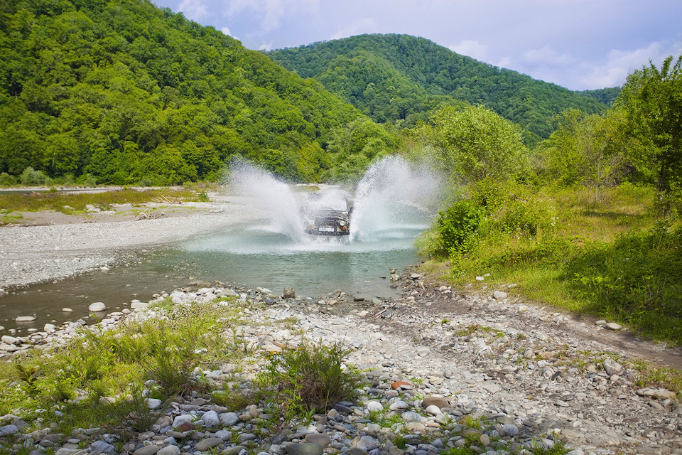 Очень захватывающе ехать по камням, валунам горной реки Шахе. Мы пересекали броды на реке, потом просто ехали вдоль берега, затем снова по реке. Глубина реки с каждым разом становилась все больше, страшнее, но наш водитель как истинный горец был непоколебим — все шел напролом дальше.