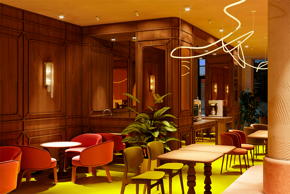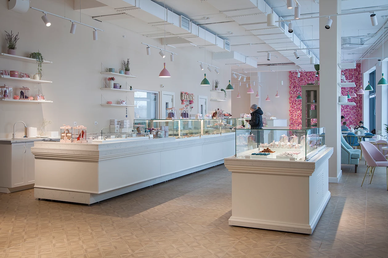 — Была задача сделать выделяющееся модное место. На входе появилась волнистая стена, фишкой стал пол лаймового цвета — он создает настроение свежести, — говорят в бистро. — Мебель сделана на заказ — в ней можно разглядеть отсылки к ювелирным украшениям: например, на столах сделали резные ножки-бусинки.