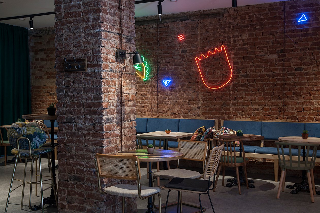 Фишка бистро в декоре — современность здесь переплетается с прошлым: мебель и посуду для зала выбрали в ретростиле, а стены украсили неоновыми вывесками и постерами аниме.