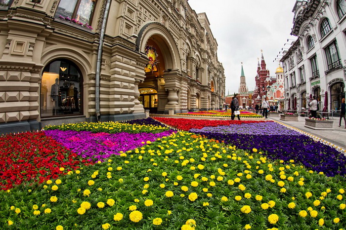 В эти выходные у москвичей и гостей столицы есть последняя возможность полюбоваться прекрасными цветами: петуниями белыми, геранями розовыми, колеусами оранжевыми, агератумами сиреневыми и другими. Многообразие поражает насыщенностью ароматов и ярких красок. Клумбы по внешнему фасаду здания подсвечены иллюминацией.