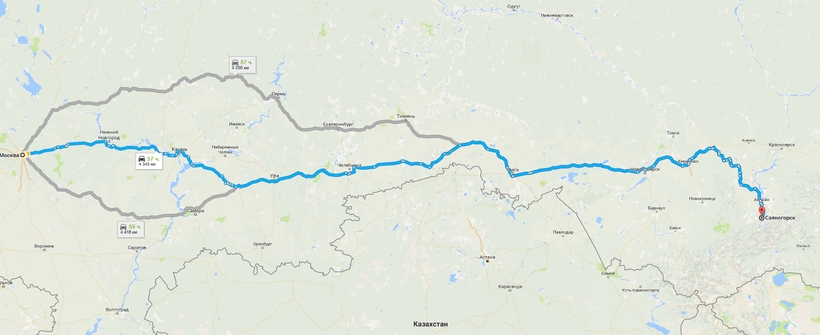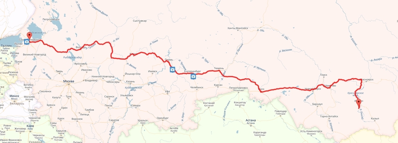 Самый удобный маршрут проходит по федеральной автомобильной дороге М5, с остановками на ночь в Бугульме, Кургане и Новосибирске (я за аккуратную езду по автобану, поэтому больше 1 200 км в день не закладывала).