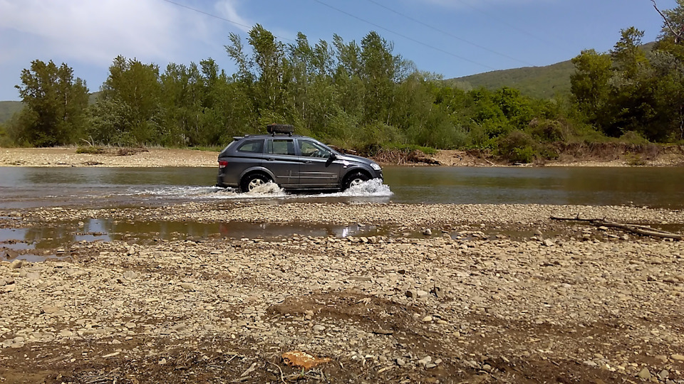 Проезжаем село Фанагорийское и по гравийной дороге едем дальше. Далее будет брод через ручей Семенеевская щель. Некоторые водители легковых авто останавливаются здесь и дальше идут пешком. Но обычно ручей мелководный и легко проезжается на любой легковушке. Вода доходит только до половины колеса, дно ручья каменистое и ровное. Конечно, весной либо после дождей воды в ручье больше и преодолеть его будут проблематичнее.