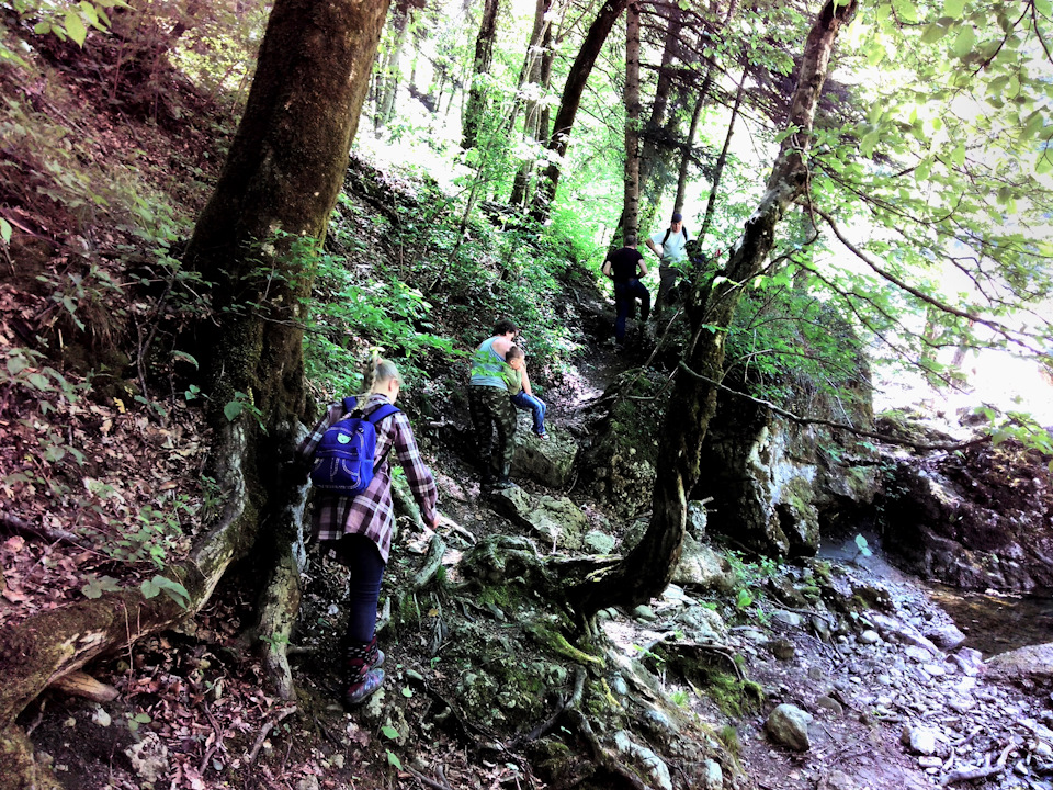 Но все равно, не смотря на сокращенный путь топать на водопад пришлось еще минут 30, по горной тропинке, неся в большинстве случает Андрея, то на одной руке, то на шее, то на руках.