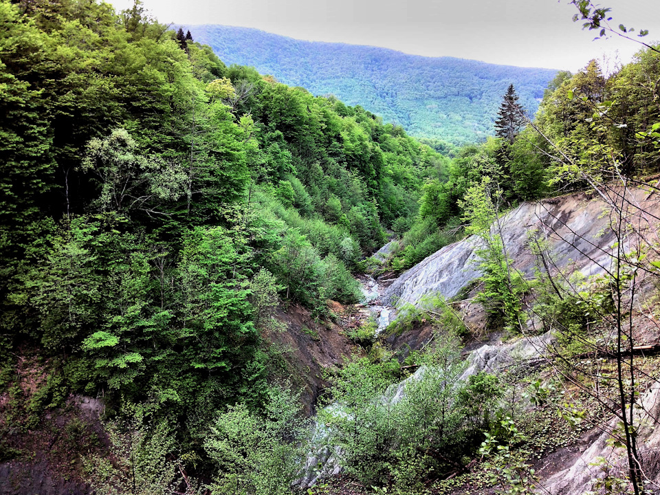 Липецкие ребята сказали, что выше есть каскад водопадов и еще типа озеро наверху водопада. Забираться туда сложно и достаточно опасно, так как началась уже серьезная горная местность без троп и с серьезным почти вертикальным уклоном. Весенняя почва абсолютно не держала вес тела, тем более моего без малого 100 киллограмового, но тем не менее, подтягивая друг друга в сложных места, мы с липецким товарищем забрались. Иногда было немного страшновато, если переоценить свои возможности и сорваться остановишься об камень метров через 50-100 веселого кувыркания с горки.