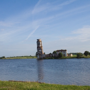 Полуразрушенная Запогостская церковь. Построенная в 1802 году, в 1961 году она была затоплена водами Шекснинского водохранилища при строительстве Волго-Балтийского канала. Это фото 2011 года, а в 2013 году из-за размыва колокольня этой церкви обрушилась. На трассе Волго-Балтийского водного пути на Вологодчине есть и ещё одна похожая полузатопленная церковь — у села Крохино, неподалёку от истока Шексны из Белого озера.