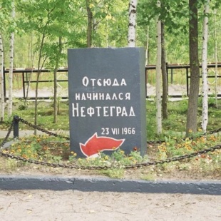 В 1966 году областной студенческий отряд Нефтяник прибыл в рыбацкую деревню Стрежевое, чтобы строить дома будущего города с предположительным названием Нефтеград. Чтобы увековечить это событие, было решено установить памятный знак, на котором были высечены слова: Отсюда начинался Нефтеград, а внизу - факел, как символ эстафеты тем, кто будет продолжать строить город, жить в нем… Информация