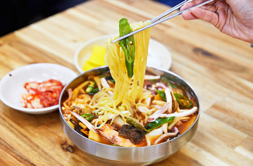 Блюда ччамппон и чачжанмён со стручковым перцем в Кунсане