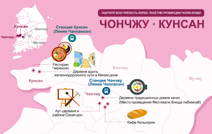 Родина гурманов - город Чончжу провинции Чолла-букдо переполнен различными вкусными блюдами и лакомствами, начиная от основного традиционного блюда корейской кухни пибимпаба и заканчивая различной уличной едой. В портовом городе Кунсане вас ожидают такие блюда как ччамппон и чачжамён, позволяющие ощутить изысканный вкус острых блюд корейской кухни. Давайте же немедля отправимся с вами в гастрономическое путешествие по городам Чончжу и Кунсан!