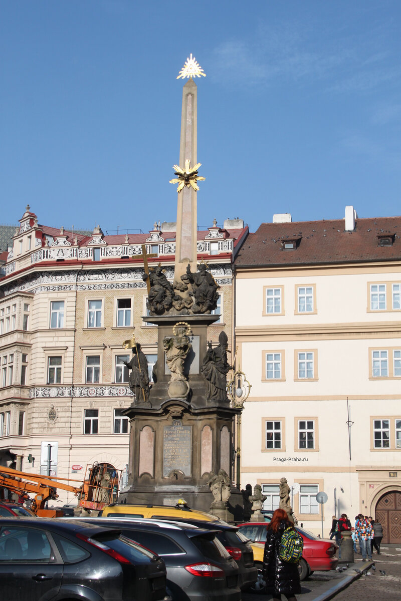 Как и другие чумные колонны, эта была сделана в знак признательности за то, что эпидемия чумы исчезла из Праги в 1713 году. Колонна была построена в 1715 году , и доработана в 1772 году. Массивный постамент сделан из песчаника и достигает высоты двадцати метров. Песчаник представляет собой черный и красный мрамор.