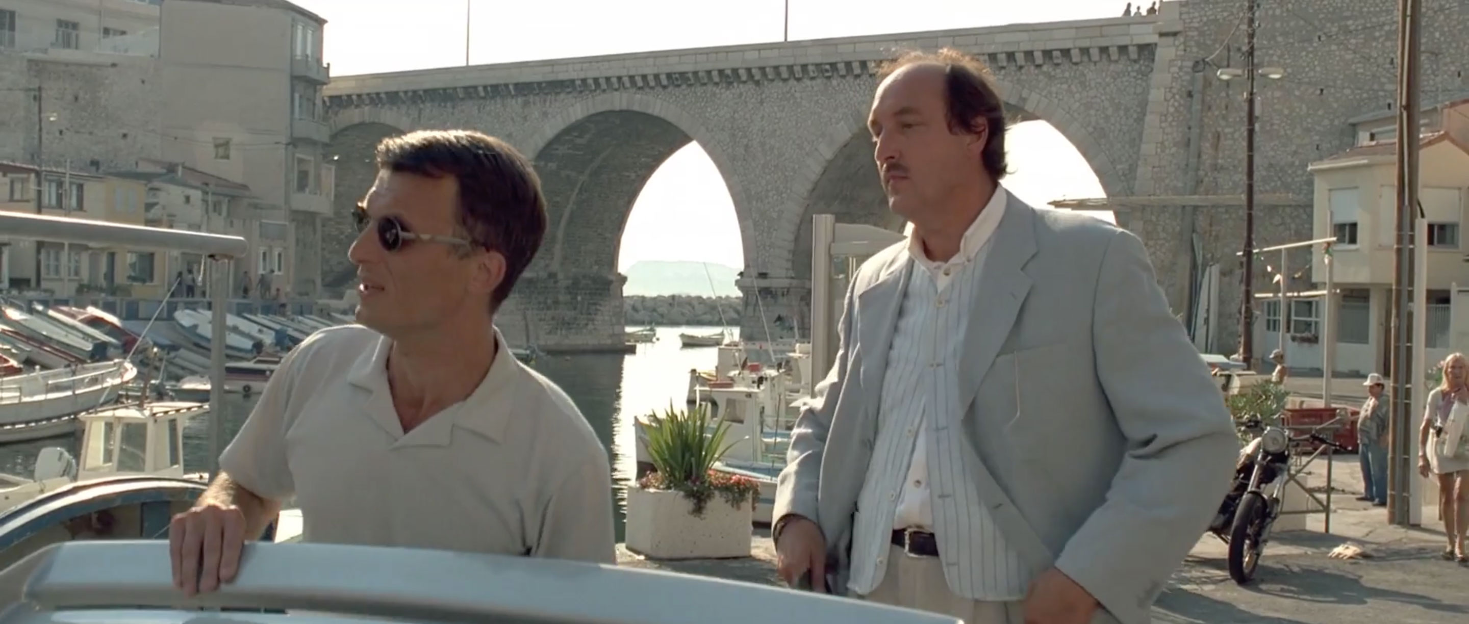 Следующий интересующий нас кадр – сцена проверки документов у немцев из серого мерседеса. На заднем плане мост. Это знаменитый Мост Фальшивых денег (Vallon des Auffes). А значит, речь идет об улице Rue de Vallon des Auffes. Кстати, многие туристы стремятся снять квартиру с видом на этот старинный мост.