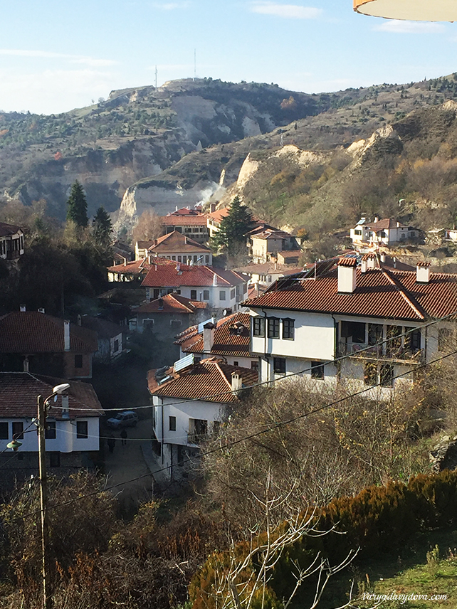 Современное название Мелника – чисто славянское, и происходит оно не от мельниц, а от мела – городок окружен скалами из известняка. Мелнишки пирамиды, о которых вы, возможно, слышали (а если не слышали, то можете увидеть в видеоролике ниже) – это именно известняк, мягкий камень, которому ветер придал необычные формы.