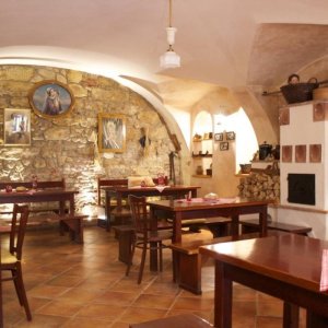 Интерьер большого зала своими сводчатыми потолками напоминает и о средневековом рыцарском замке, и о келье монаха. Столы, стулья и скамьи солидного темного дерева красноватого оттенка, удачно сочетаются с цветом пола, с каменной кладкой стены и с медью пивных цистерн. Тут же – настоящая дровяная печь, как в старом чешском деревенском доме.