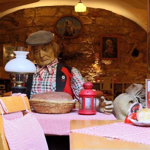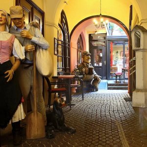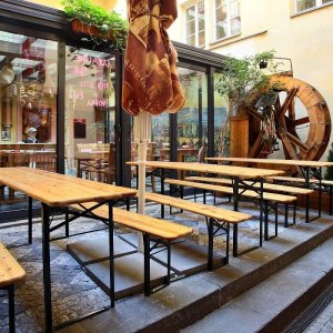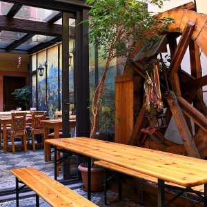 Интерьер веранды проще и воздушней, вместо массивных скамеек тут стоят простые, но удобные столы и стулья из светлого дерева. Посреди зала, за маленькой конторкой сидит Старший мельник (в чью честь пивная и получила свое название). Эта забавная фигура в человеческий рост, окружена гроссбухами и мешками с мукой – славно потрудившийся мельник ведет свою сложную бухгалтерию. В заведении есть еще несколько подобных фигур: Мельничиха, Хлебопек, Кухарка и даже Бездельник, сидящий за столиком со своим аккордеоном. Добавляет атмосферы и старое мельничное колесо у стены.