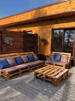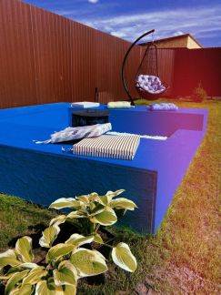 Каждая беседка имеет свою собственную, огороженную территорию, мангальную зону, деревянную лаунж-зону с цветными пуфиками, стильное лобное место с костровищем, качелями, елочками и цветами.