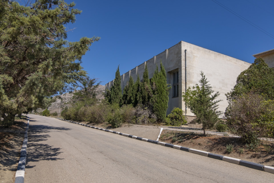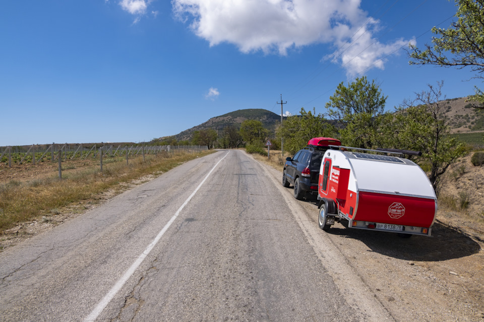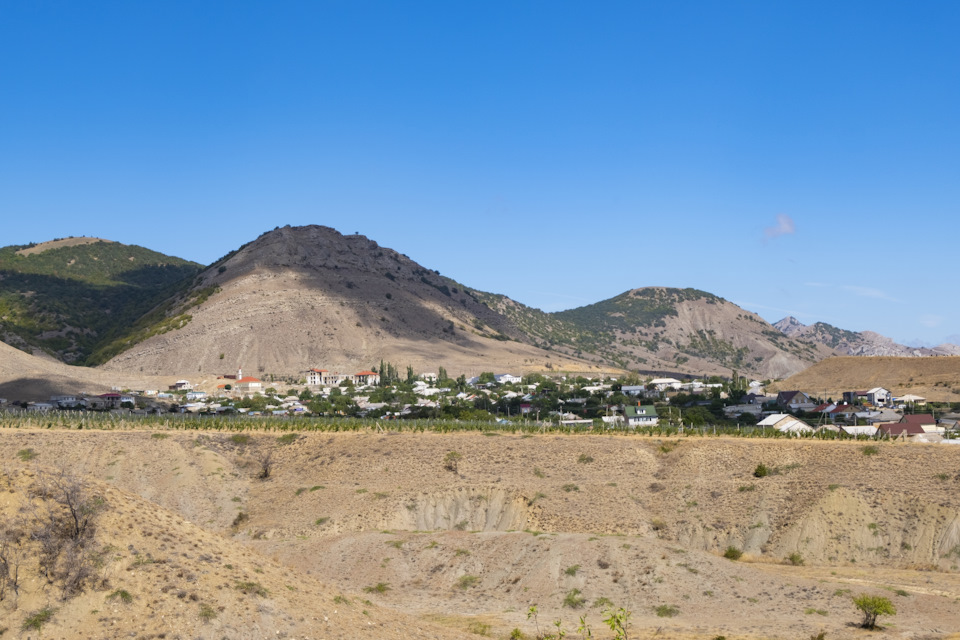 Полный размер Солнечная долинаСолнечная Долина расположена в окружении гор у южных отрогов хребта Эчки-Даг, защищающих ее от северных ветров. Поэтому издревле в этих местах занимались виноделием, а сейчас тут находится завод по производству вин с одноименным названием. Навигатор показывал, что до фирменного магазина винзавода нужно было спуститься вниз по улице. Пока местные жители рассматривали нашу технику, мы захотели пройтись пешком, оставив караван на обочине.